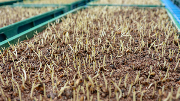 在育秧工廠內(nèi),一條機械化流水線設(shè)施貫穿車間,車間工人只需要將催芽框放置在履帶之上,即可實現(xiàn)自動填土、播種、藥劑消毒等一系列操作,隨后用平板車將催芽框轉(zhuǎn)移至恒溫恒濕培養(yǎng)室,靜待數(shù)日,即可得到生機盎然的新生嫩芽。