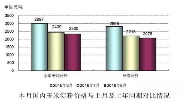 2016年7-8月份國(guó)內(nèi)淀粉價(jià)格先跌后漲,總體仍呈下跌趨勢(shì)。8月份全國(guó)淀粉平均價(jià)格為2330元/噸,環(huán)比下降108元/噸,降幅4.45%;同比下降667元/噸,降幅22.25%。其中,長(zhǎng)春地區(qū)淀粉出廠價(jià)格為2078元/噸,環(huán)比下跌137元/噸,降幅6.18%;同比下降730元/噸,降幅25.99%。