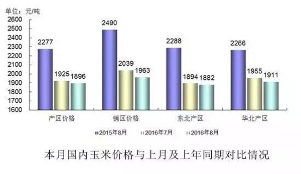 2016年8月份,我國(guó)玉米產(chǎn)區(qū)平均價(jià)格1896元/噸,比上月下降28元/噸,降幅1.48%;同比下降381元/噸,降幅16.73%。其中,東北產(chǎn)區(qū)價(jià)格為1882元/噸,環(huán)比下降12元/噸,降幅0.66%,同比下降407元/噸,降幅17.77%;華北黃淮產(chǎn)區(qū)價(jià)格為1911元/噸,環(huán)比下降44元/噸,降幅2.27%,同比下降355元/噸,降幅15.68%;國(guó)內(nèi)銷區(qū)玉米價(jià)格為1963元/噸,環(huán)比下降76元/噸,降幅3.75 %,同比下降527元/噸,降幅21.18%(圖)。