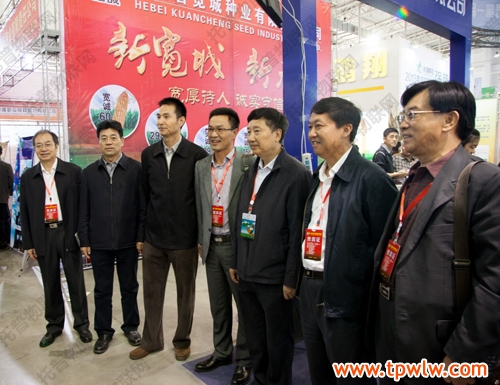 圖為:托普總經(jīng)理陳渝陽先生引領(lǐng)農(nóng)業(yè)部種子管理局張延秋局長(右二),吉林農(nóng)委李國強主任,全國農(nóng)技推廣服務(wù)中心黨委杭大鵬(右四)書記等領(lǐng)導(dǎo)參觀公司展臺