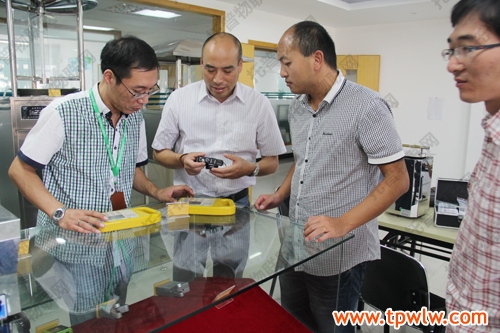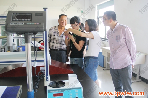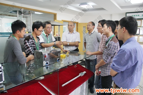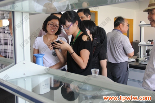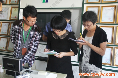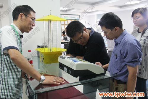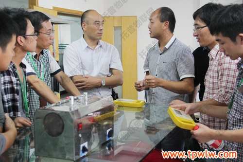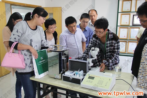 圖為:嘉善縣農(nóng)經(jīng)局科教科郁新偉科長(zhǎng)(著白色衣服)與眾人一起討論儀器相關(guān)知識(shí)