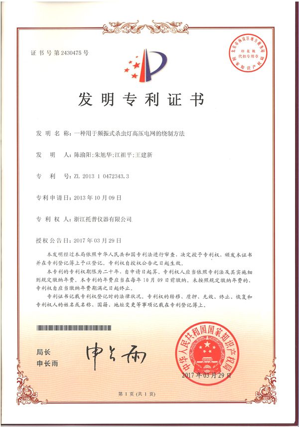 - 托普云農(nóng)又喜獲發(fā)明專利發(fā)表日期:2017-04-14 來源:托普云農(nóng) 瀏覽次數(shù):4435次近日,我司托普云農(nóng)又喜獲一項發(fā)明專利。據(jù)悉,該發(fā)明專利名稱為“一種用于頻振式殺蟲燈高壓電網(wǎng)的繞制方法”,發(fā)明專號為ZL201310472343.3。相較于傳統(tǒng)的殺蟲燈繞制方法,“一種用于頻振式殺蟲燈高壓電網(wǎng)的繞制方法”是一種用專門設(shè)計的螺旋繞線機(jī)實現(xiàn)殺蟲燈高壓電網(wǎng)繞線的方法。該發(fā)明專利于2013年10月9日向國家知識產(chǎn)權(quán)局申請,并于2017年3月29日正式得到授權(quán)。據(jù)業(yè)內(nèi)專家評價,該專利由于電網(wǎng)間距由螺桿螺距保證,使得繞制后的電網(wǎng)間距均勻一致。此外,繞制方法操作方便,繞制效率高且繞線緊致不易松落造成短路,具有良好的普及運用價值。