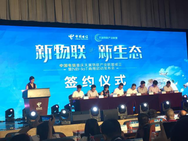 中國電信重慶天翼物聯(lián)產(chǎn)業(yè)聯(lián)盟成立暨NB-IoT商用啟動(dòng)發(fā)布會(huì)現(xiàn)場的簽約儀式