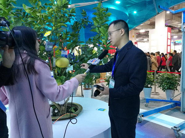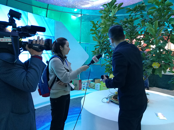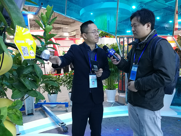 展會(huì)現(xiàn)場(chǎng)掛上傳感器的文旦樹“在這棵文旦樹上,我們安裝了無線葉面溫度傳感器、光照強(qiáng)度傳感器、果實(shí)膨大傳感器。通過這些傳感器采集傳輸?shù)臄?shù)據(jù),我們就能知道整個(gè)樹的生長秘密”。展會(huì)現(xiàn)場(chǎng),現(xiàn)代農(nóng)業(yè)與信息化的互融發(fā)展,吸引浙江衛(wèi)視、杭州電視臺(tái)、蕭山日?qǐng)?bào)、舟山電視臺(tái)、金華電視臺(tái)等記者前來采訪。
