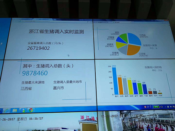 本屆農(nóng)博會(huì)信息化元素顯著,重點(diǎn)展出農(nóng)業(yè)數(shù)據(jù)庫建設(shè)、農(nóng)業(yè)智慧管理、追溯體系建設(shè)、農(nóng)產(chǎn)品電子商務(wù)發(fā)展。在農(nóng)博會(huì)上,由托普云農(nóng)子公司浙江森特信息技術(shù)有限公司為浙江省畜牧獸醫(yī)局研發(fā)的浙江省智慧畜牧云平臺(tái)也亮相現(xiàn)場。 動(dòng)態(tài)在線監(jiān)管,實(shí)時(shí)顯示豬舍、消毒通道、屠宰車間等畫面。