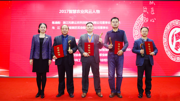 圖:托普云農(nóng)董事長(zhǎng)陳渝陽獲得2017 智慧農(nóng)業(yè)風(fēng)云人物證書位列其中