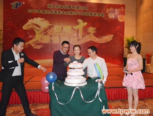 年會(huì)晚宴進(jìn)行到中段,工作人員推上來一個(gè)漂亮的三層蛋糕,陳總、婷姐、朱總?cè)艘黄鹎虚_蛋糕,為托普十周歲生日慶賀。每一位托普家人臉上都綻開幸福的笑容,口中輕唱著歡樂的生日歌,為托普儀器的成長(zhǎng)送去誠(chéng)摯的祝福。