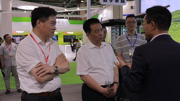 全國(guó)農(nóng)業(yè)技術(shù)推廣服務(wù)中心主任魏?jiǎn)⑽模ㄗ蠖?、園藝處處長(zhǎng)周澤宇(左一)、副處長(zhǎng)冷楊(右一)參觀托普云農(nóng)展位
