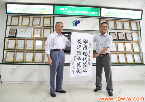 圖為:陳部長為托普儀器題下十二字勉勵(lì)之語:助推現(xiàn)代農(nóng)業(yè),促進(jìn)行業(yè)發(fā)展