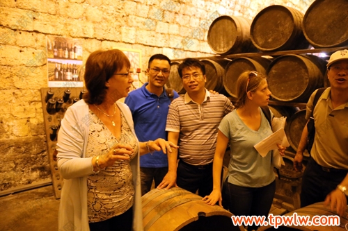 圖為:托普儀器陳渝陽總經(jīng)理(左二)隨考察團(tuán)參觀葡萄酒廠