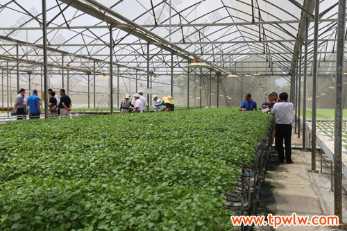 圖為:考察團(tuán)考察無土栽培種植技術(shù)