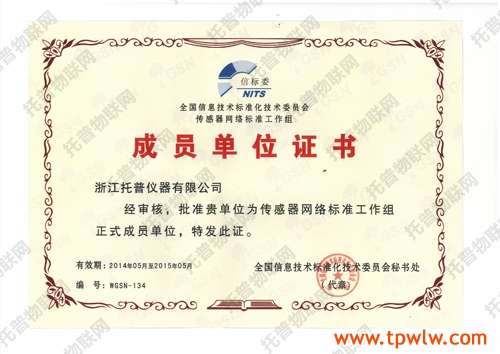 圖為:國家傳感器網絡標準工作組成員單位證書