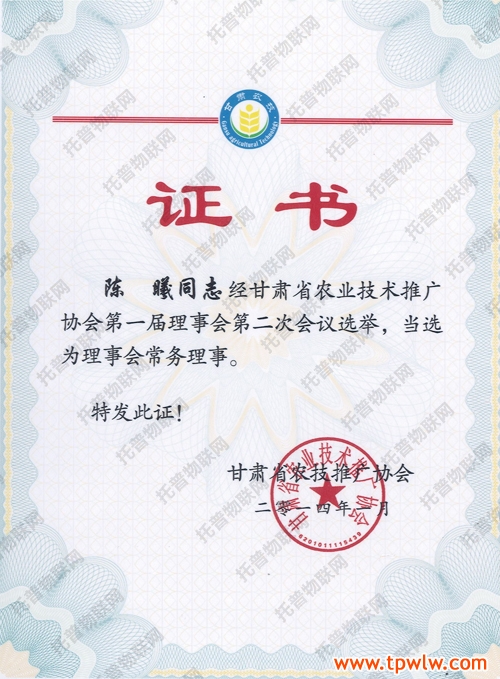 圖為:托普儀器陳曦經(jīng)理任甘肅省農(nóng)業(yè)技術(shù)推廣協(xié)會(huì)常務(wù)理事證書(shū)