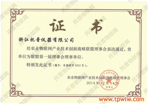 2014年6月7日,北京智慧農(nóng)業(yè)物聯(lián)網(wǎng)產(chǎn)業(yè)技術(shù)創(chuàng)新戰(zhàn)略聯(lián)盟籌備成立大會暨第一次會員代表大會在北京召開。會議宣讀了決定準(zhǔn)予《北京智慧農(nóng)業(yè)物聯(lián)網(wǎng)產(chǎn)業(yè)技術(shù)創(chuàng)新戰(zhàn)略聯(lián)盟》籌備的行政批復(fù),并經(jīng)首屆理事會表決,選舉產(chǎn)生了第一屆聯(lián)盟組織機構(gòu),其中包括首屆聯(lián)盟主席單位,五家聯(lián)盟副主席單位,“浙江托普儀器有限公司”等八家單位當(dāng)選為聯(lián)盟第一屆理事會理事單位。