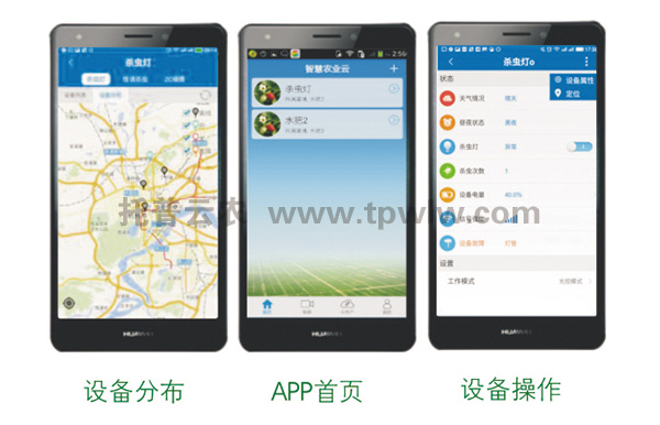 2、可通過Web端與APP遠(yuǎn)程控制。足不出戶就可以殺蟲燈了解地理位置、設(shè)備編號、基地名稱、故障報警信息。