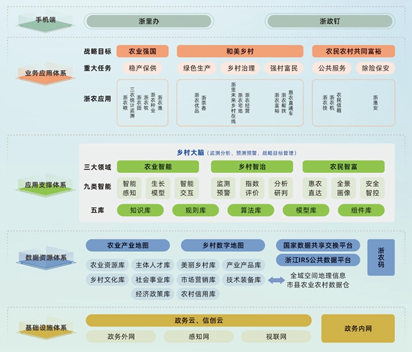 浙江省農(nóng)業(yè)農(nóng)村廳圍繞省委數(shù)字化改革決策部署,聚焦大腦監(jiān)測分析評價、預(yù)測預(yù)警和戰(zhàn)略目標管理能力的新目標,大力推進"浙江鄉(xiāng)村大腦 +浙農(nóng)系列應(yīng)用"體系建設(shè),迭代形成以"11153"核心構(gòu)架為支撐的"浙江鄉(xiāng)村大腦"(1個數(shù)據(jù)倉,1張全域地理信息圖,1個"浙農(nóng)碼”,5個庫為知識庫、規(guī)則庫、算法庫、模型庫和組件庫,3領(lǐng)域能力為農(nóng)業(yè)智能、鄉(xiāng)村智治、農(nóng)民智富),按照'一表一圖N清單"的方法,開發(fā)建設(shè)9個智能模塊,以數(shù)字技術(shù)助力農(nóng)業(yè)農(nóng)村現(xiàn)代化、鄉(xiāng)村振興和農(nóng)民農(nóng)村共同富裕。目前,"浙江鄉(xiāng)村大腦"已實現(xiàn)省市縣三級貫通。