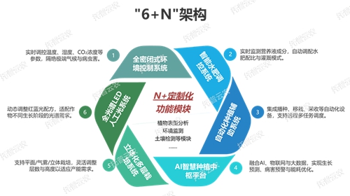 該方案基于"6+N"架構(gòu)構(gòu)建:全密閉式環(huán)境控制系統(tǒng)精準(zhǔn)調(diào)控溫濕度及CO?濃度,隔絕外界干擾;全光譜LED光系統(tǒng)動(dòng)態(tài)調(diào)整紅藍(lán)光配方適配作物生長周期;立體栽培系統(tǒng)通過平面、多層、氣霧模式靈活適配產(chǎn)能需求;智能水肥系統(tǒng)實(shí)時(shí)監(jiān)測營養(yǎng)液成分并自動(dòng)調(diào)配灌溉;自動(dòng)化設(shè)備實(shí)現(xiàn)播種、移栽、采收全流程無人化操作;AI中樞整合物聯(lián)網(wǎng)與大數(shù)據(jù),提供生長預(yù)測與病害預(yù)警;另可擴(kuò)展植物表型分析、環(huán)境監(jiān)測等N個(gè)定制模塊,形成閉環(huán)智能生產(chǎn)體系。